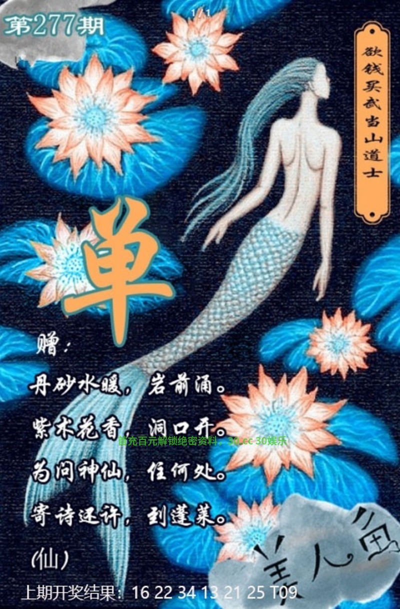 277期:美人鱼 解:丹砂水暖,岩前涌。紫禾花香,洞口开。为问神仙,住何处。寄诗还许,到蓬菜 综合:猪虎牛鼠羊猴 特码:19.31.04.16.05.17.18.30.23.35.10.22 |