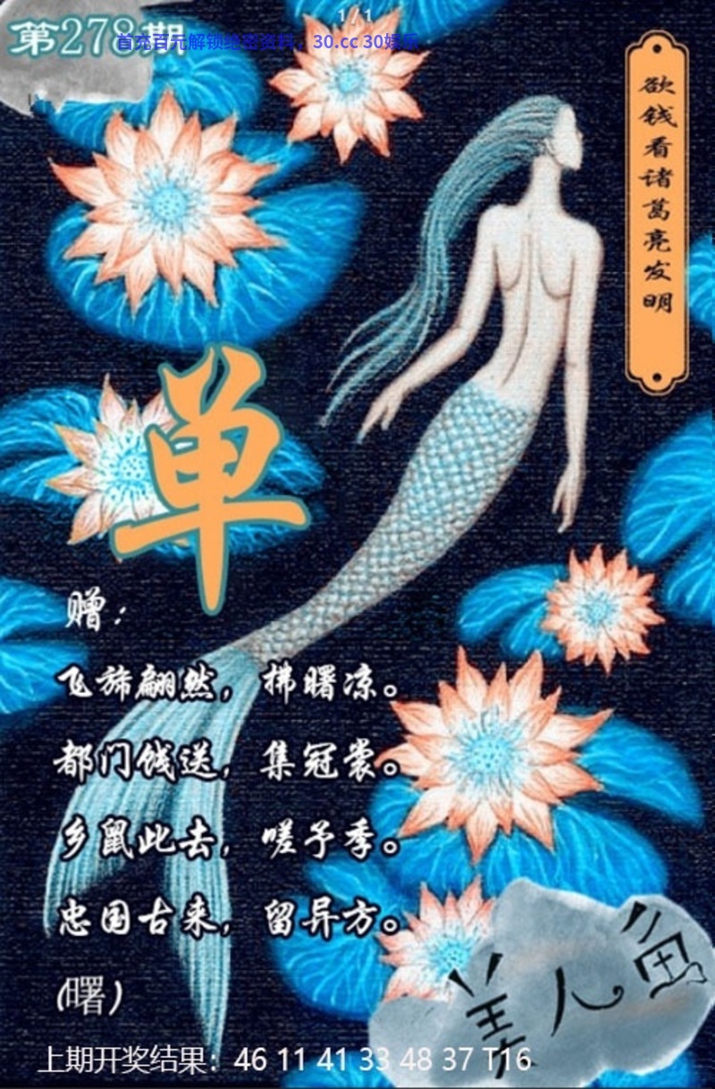 278期:美人鱼 解:飞稀翩然,拂曙凉。都门饯送,集冠裳。乡鼠此去,嗟予季。忠国古来,留异方 综合:羊马狗虎猴牛 |